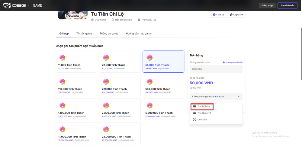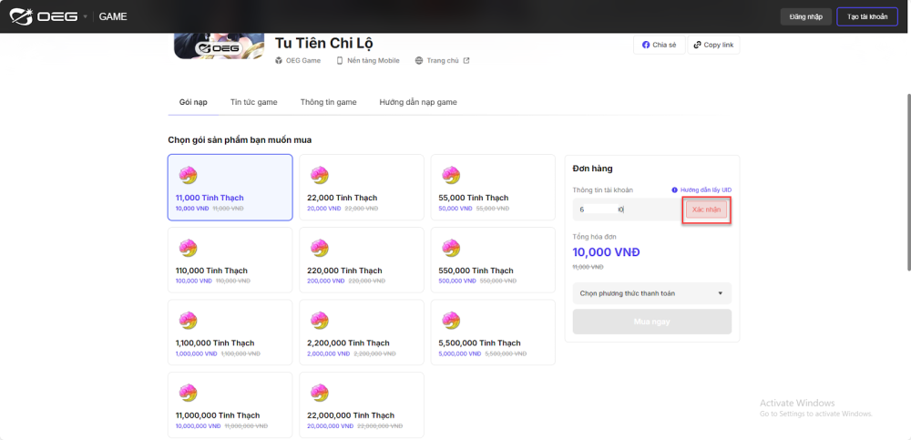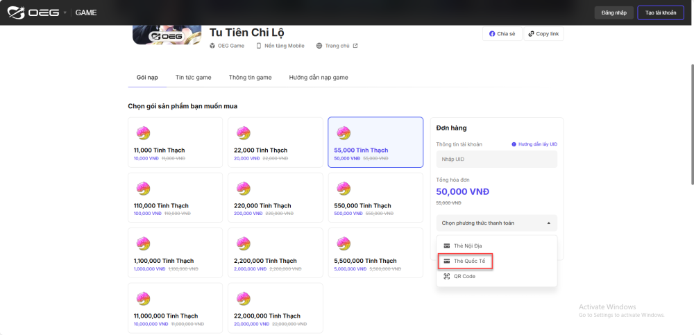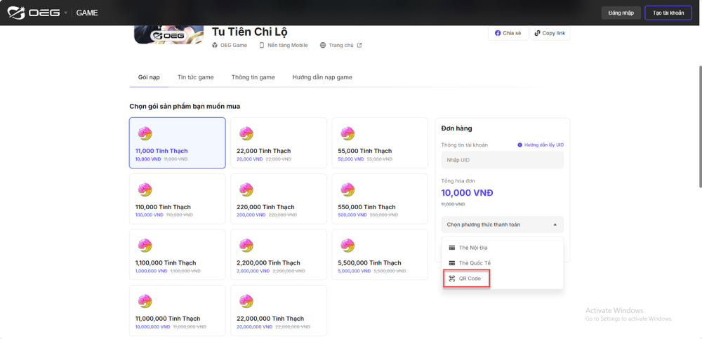 Bước 2: Chọn gói Tinh Thạch muốn nạp và nhập UID nhân vật