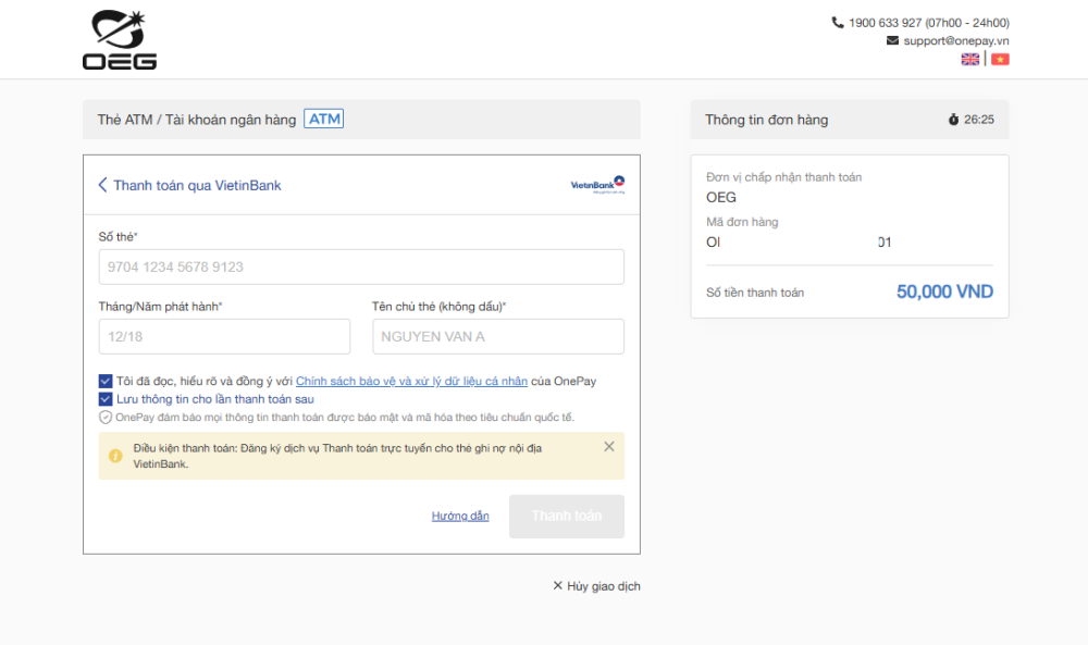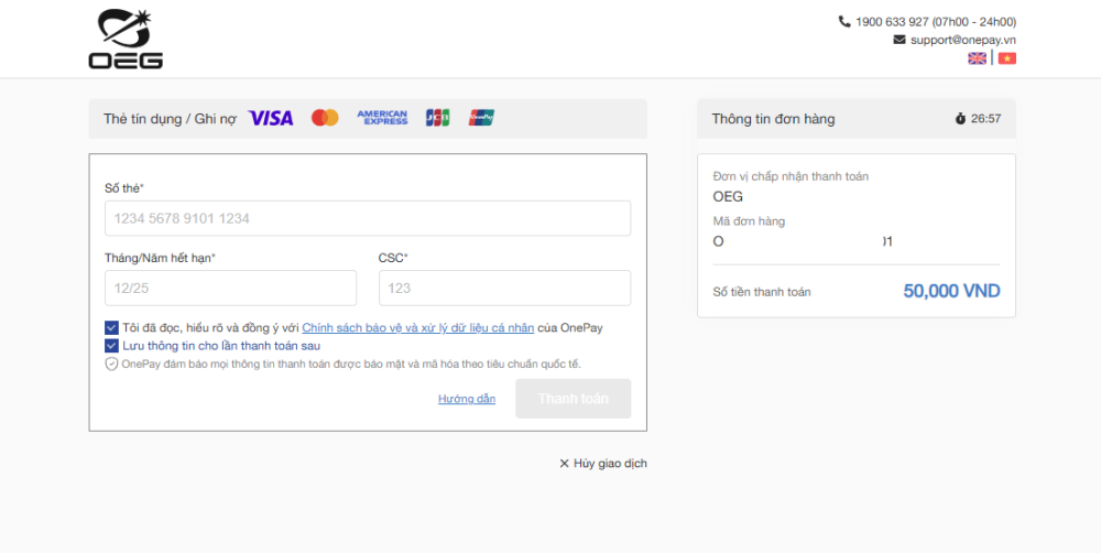 Bước 4: Nhập thông tin thẻ và thông tin xác nhận của ngân hàng -> Thanh toán và hoàn tất giao dịch